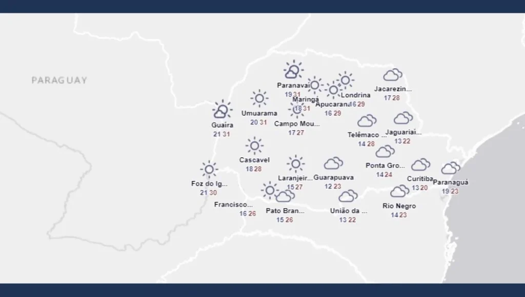 Nas demais regiões do estado, o tempo fica estável e faz calor durante a tarde, especialmente do oeste ao norte do Paraná.