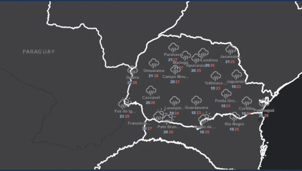 Deste modo, a chuva deve ser melhor distribuída no estado e o risco para a ocorrência de tempestades aumenta. Haverá bastante cobertura de nuvens na maior parte das regiões paranaenses. Entre o Oeste e Noroeste, há possibilidade de abertura de sol entre nuvens no período da tarde.