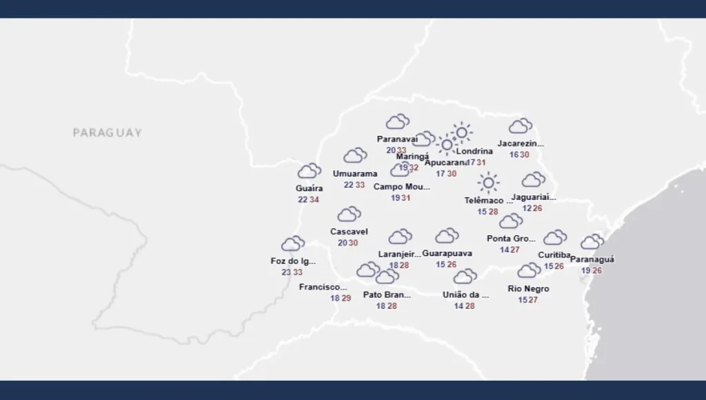Nesta segunda-feira, o tempo permanece estável em todas as regiões do Paraná. Com o sol predominando, a tarde será com temperaturas elevadas nas diversas regiões.