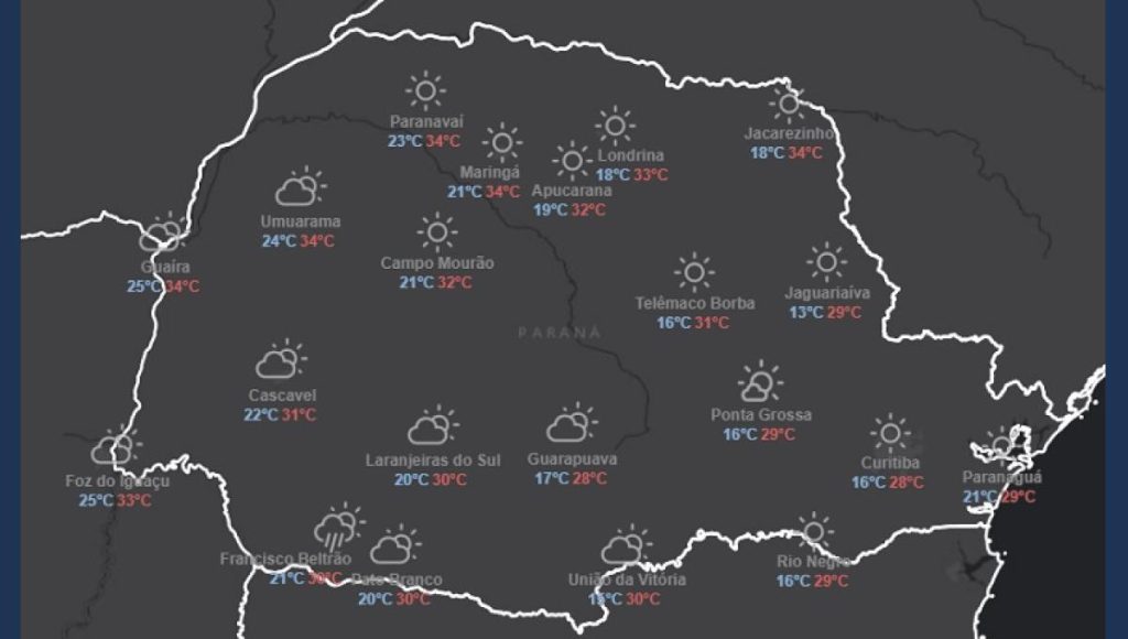 No interior do estado a sensação térmica fica elevada ao longo do dia. Além disso, entre o oeste, sudoeste e sul paranaense podem ocorrer chuvas isoladas à tarde.