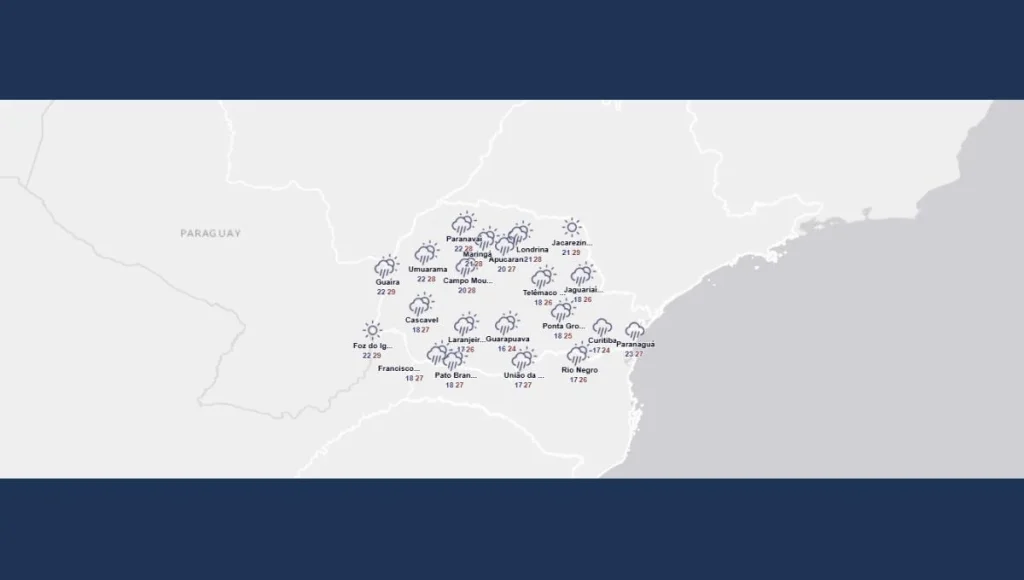 Entre a RMC e o litoral, os acumulados de chuva deverão ser significativos, podendo superar os 50 mm em alguns pontos. As temperaturas máximas deverão atingir valores próximos dos 30 °C nas regiões Sudoeste, Oeste, Noroeste, Norte Central, Norte Pioneiro e no litoral, enquanto no Centro-Sul, Sudeste, Campos Gerais e na RMC, as máximas ficarão em torno de 25 °C.