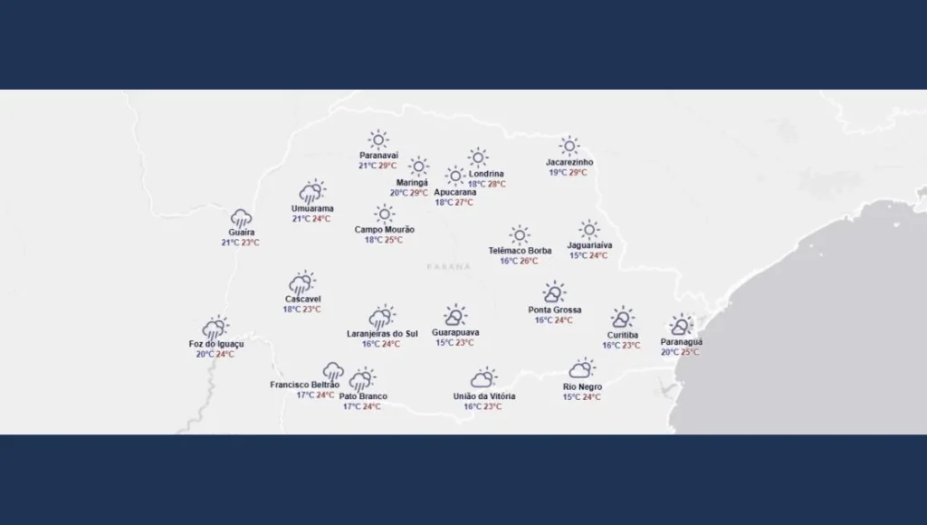 Pancadas de chuva acompanhadas de descargas elétricas ocorrem entre o noroeste, oeste, sudoeste e centro-sul ao longo do dia, com maior intensidade entre a tarde e noite. Nas demais regiões paranaenses, não há expectativa de eventos severos, e o calor é mais expressivo no norte do estado. Entre a RMC e praias segue com muitas nuvens e garoa/chuvisco ocasional. Temperaturas ficam amenas.