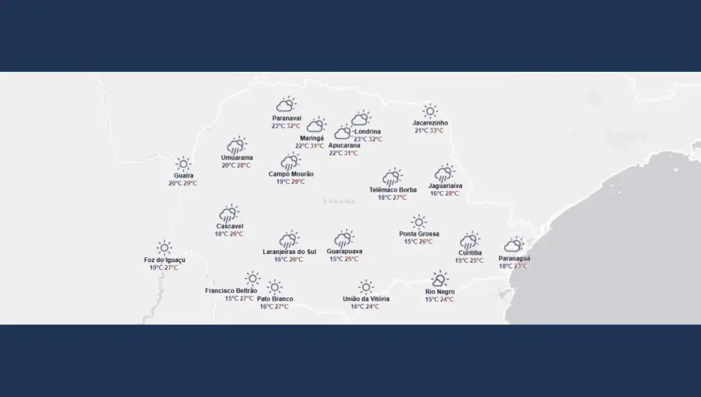 O risco para o desenvolvimento de tempestades localizadas, será maior durante a tarde, especialmente nas áreas centrais do estado e nos Campos Gerais. As temperaturas máximas devem permanecer mais elevadas na faixa norte, onde os termômetros poderão registrar valores superiores a 33 °C.