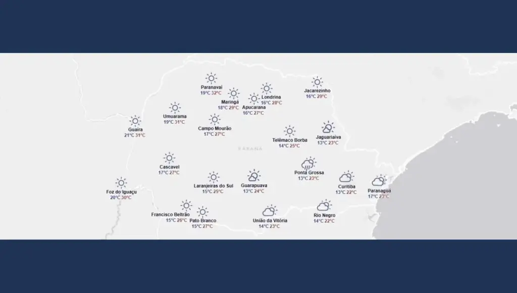 O destaque do dia será a elevação significativa das temperaturas máximas. Após uma semana com valores mais baixos, sobretudo nas áreas centrais e leste do estado, as máximas deverão ultrapassar os 20 °C em todo o Paraná, podendo se aproximar dos 35 °C em municípios do Noroeste.