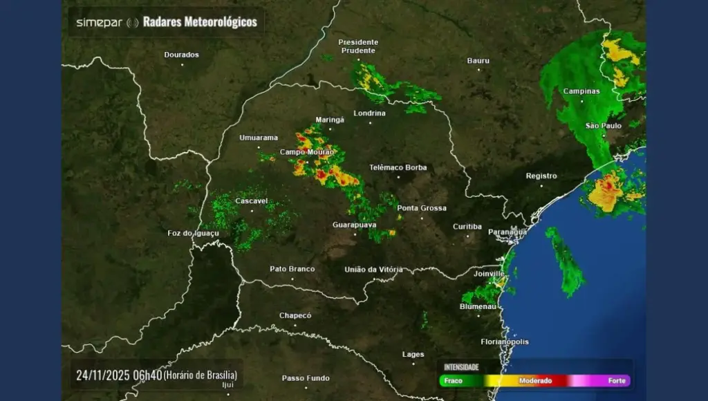 Atenção: a região apresenta previsão de acumulados superiores a 100 mm no período, caracterizando situação de risco. As temperaturas apresentam leve redução: na Região Metropolitana de Curitiba, os termômetros não devem ultrapassar os 22 °C, enquanto no Noroeste e no Sudoeste as máximas permanecem abaixo dos 30 °C.