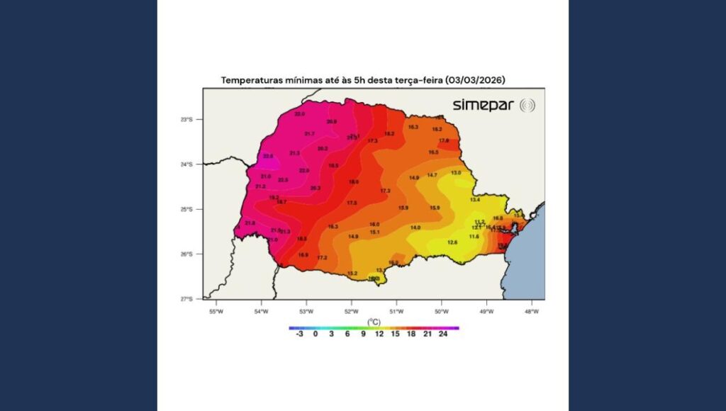 As temperaturas na terça-feira (03) em Apucarana e região devem oscilar entre a mínima de 18ºC e a máxima de 31ºC, conforme o Simepar.