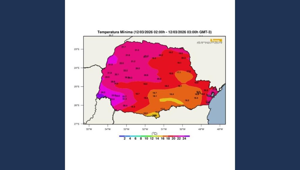 No amanhecer, as temperaturas deverão variar entre 14 °C e 16 °C no Centro-Sul, Campos Gerais, Sudeste e Leste. Nestas regiões, as máximas tendem a permanecer amenas devido à densa cobertura de nuvens. Já na faixa oeste, as temperaturas máximas poderão se aproximar ou até superar ligeiramente os 30 °C.