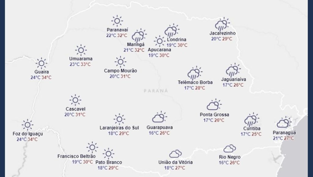Alguma variação de nuvens entre o leste e norte/nordeste do estado, com previsão de chuva rápida a partir da tarde. Temperaturas se elevam na região, com destaque no Paraná, para os setores oeste e norte, com valores mais elevados.