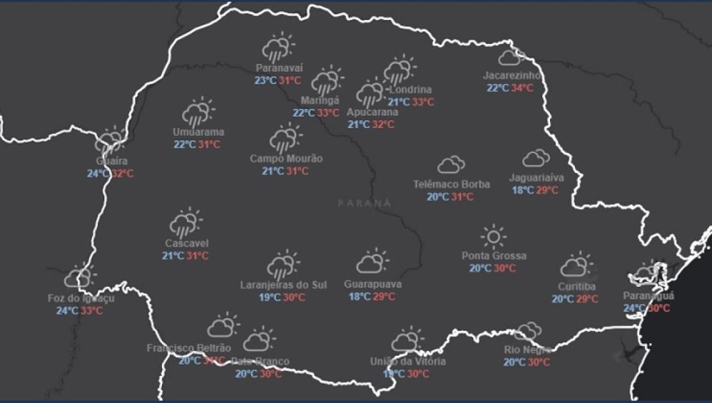 O risco para ocorrência de tempestades também se mantém, sendo mais evidente no interior paranaense. Temperaturas continuam bastante elevadas.