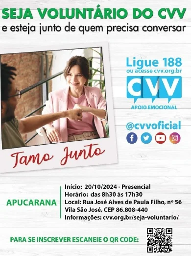 O Núcleo de Apoio à Vida de Apucarana (Naviap) está com inscrições abertas para nova turma de voluntários para atuar no Centro de Apoio à Vida (CVV). O Programa de Seleção de Voluntário (PSV) terá início no dia 20 de outubro. Os interessados precisam ter mais de 18 anos e passar pelo treinamento conduzido por voluntários do CVV.