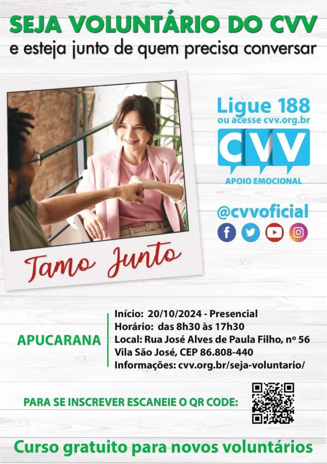 Para fazer a inscrição é só entrar no site o CVV e entrar na aba Voluntário. Outra opção é apontar a câmera para o QR Code do cartaz de divulgação.