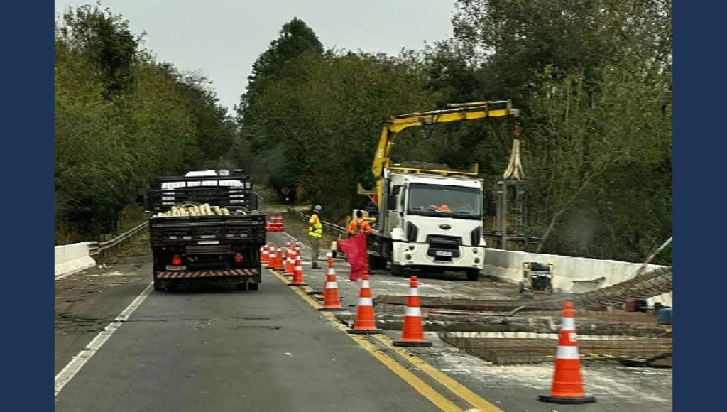 Ponte sobre o Rio dos Índios recebe novas lajes de transferência em concreto armado e reforço estrutural dos pilares. Tráfego está em meia pista no local.