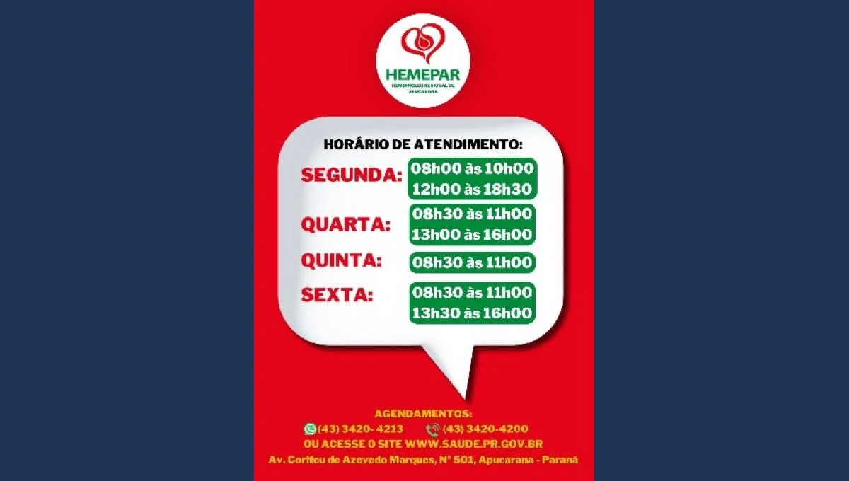 Os hemocentros de Apucarana e Londrina estão com as portas abertas para receber doações. Para doar sangue, basta comparecer aos seguintes endereços: