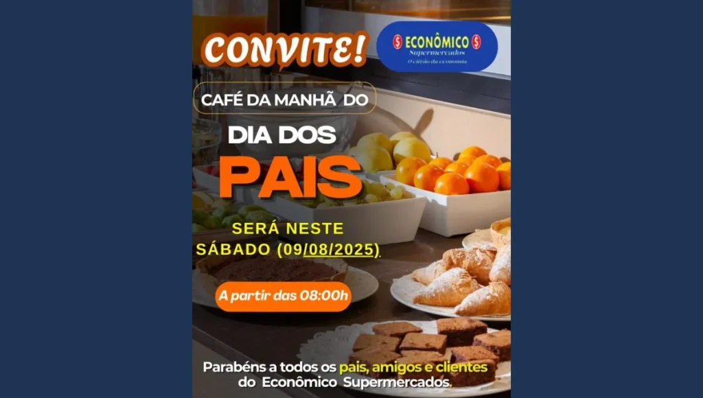 “Parabéns a todos os pais, amigos e clientes do Econômico Supermercados”, destaca a mensagem da empresa, que reforça o convite a todos para participarem da celebração.