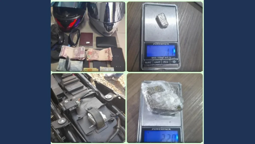Além dos itens encontrados durante a revista pessoal, uma porção adicional de substância análoga à maconha, pesando 22 gramas, foi descoberta embaixo do banco da motocicleta.