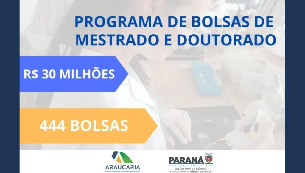 O Governo do Estado, por meio da Secretaria da Ciência, Tecnologia e Ensino Superior (Seti) e da Fundação Araucária, lançou o Programa de Bolsas de Mestrado e Doutorado. Serão investidos até R$ 30.139.200,00 em 444 bolsas de pesquisa.