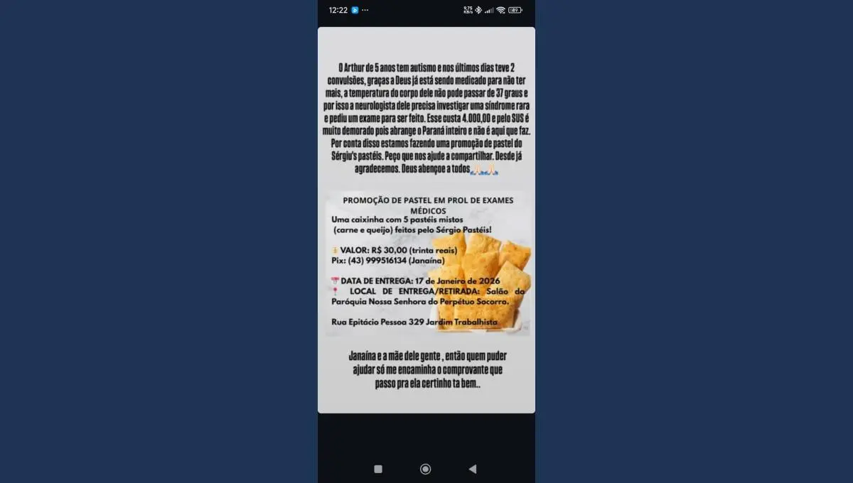 Para conseguir o valor, a família criou uma vaquinha online e também está promovendo uma ação solidária com venda de pastéis, pedindo o apoio da comunidade para compartilhar a campanha e contribuir da forma que puder.