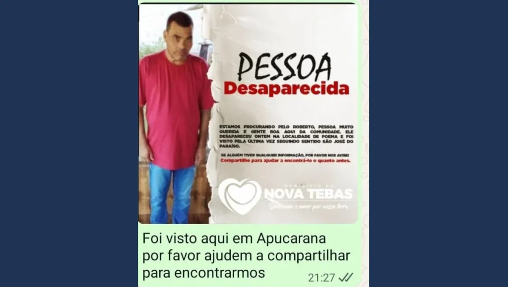 “Ele é uma pessoa muito querida e gente boa da comunidade”, destaca o comunicado divulgado com apoio da Prefeitura de Nova Tebas, que reforça o pedido para que a população da região colabore com a divulgação da imagem e das informações.