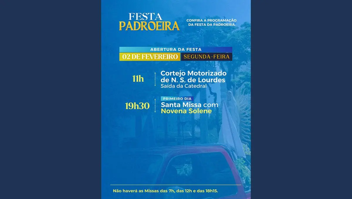 A abertura oficial da festa acontece na segunda-feira, 02 de fevereiro, com destaque para o Cortejo Motorizado de Nossa Senhora de Lourdes, às 11h, com saída da Catedral. No mesmo dia, às 19h30, será celebrada a Santa Missa com a Novena Solene, marcando o primeiro dia das celebrações.