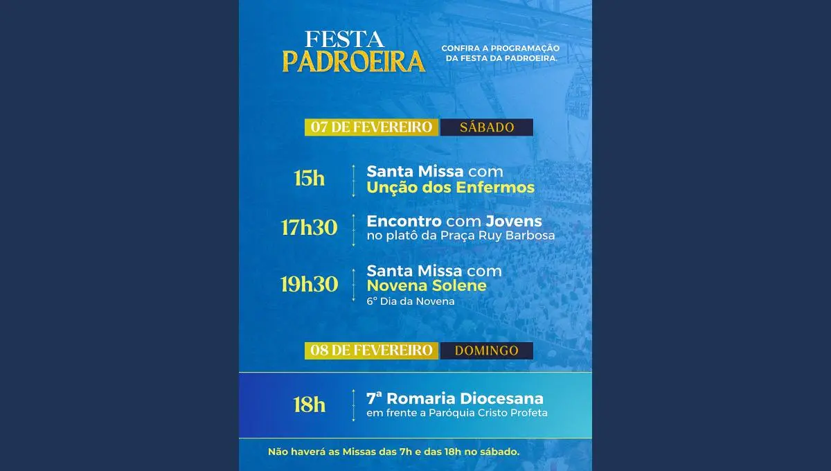 Neste dia, não haverá missas às 7h e às 18h.
