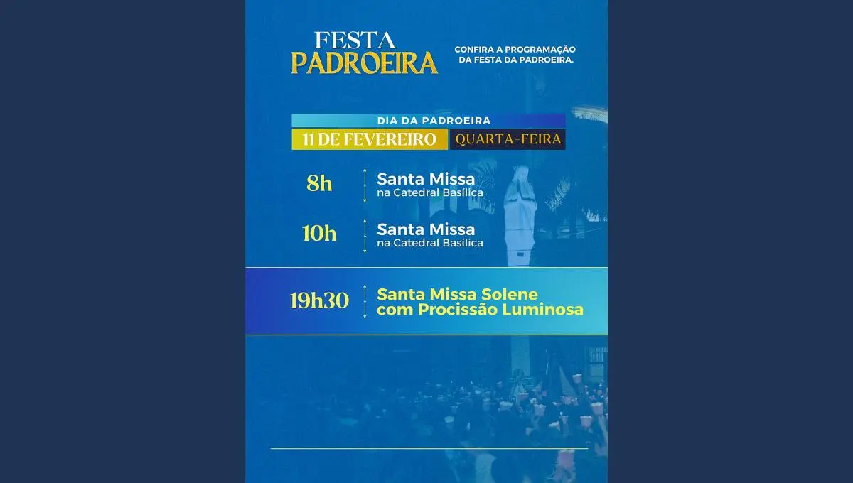 19h30 – Santa Missa Solene com Procissão Luminosa, encerrando a Festa da Padroeira com um dos momentos mais emocionantes e simbólicos para os fiéis.