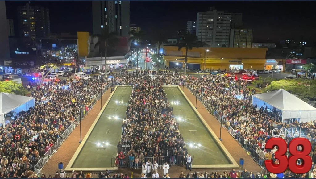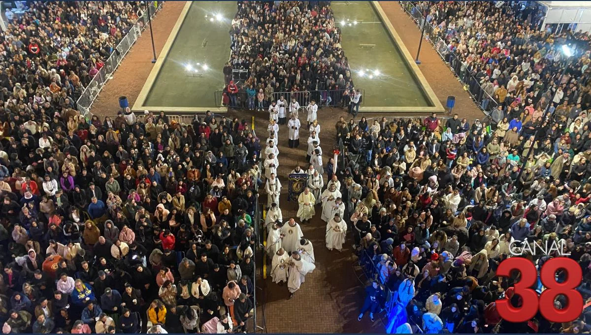 A missa, que segue em andamento, está sendo marcada por momentos de oração, cânticos e mensagens de esperança, emocionando os presentes. Uma grande estrutura foi montada para acolher o público, contando com voluntários, sistema de som e organização para garantir a segurança e o conforto dos participantes.