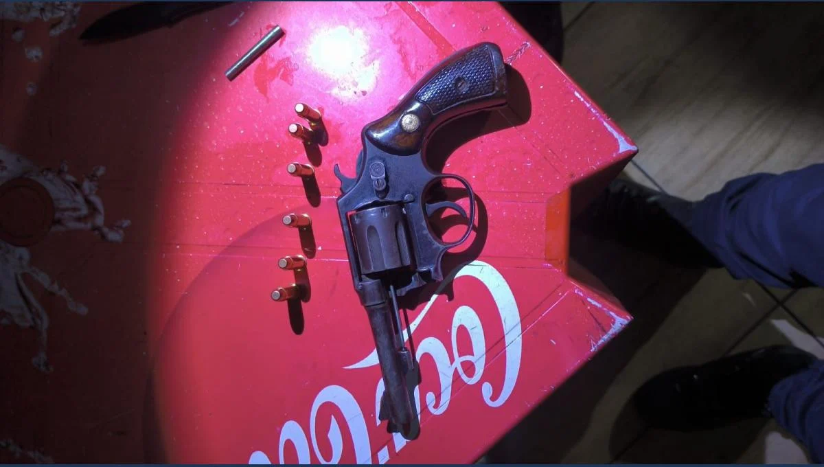 “Na busca pessoal, nada foi encontrado com ele. Porém, sua cônjuge estava sentada em cima de uma caixa de isopor, se negando a se levantar, alegando mal-estar. Após alguns minutos, ela acatou a ordem da equipe, e foi possível localizar um revólver calibre 38 com numeração suprimida, seis munições intactas e mais seis em um porta-cartuchos no local. Durante buscas no veículo, foram encontradas ainda oito munições do mesmo calibre, já deflagradas. Ambos receberam voz de prisão, ele pelo porte ilegal da arma e ela por estar escondendo o armamento.”