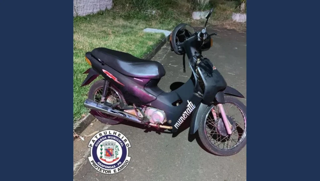 Na noite desta terça-feira (06), a Guarda Municipal de Arapongas recuperou uma motocicleta Honda Biz 100 preta, que havia sido furtada por volta das 19h na cidade. A ação ocorreu por volta das 21h05, na Rua Caboclinho Lindo, no Jardim Petrópolis.