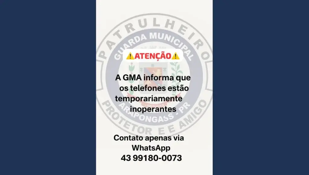 A Guarda Municipal de Arapongas (GMA) comunicou nesta segunda-feira (27), que todos os seus telefones estão temporariamente inoperantes.