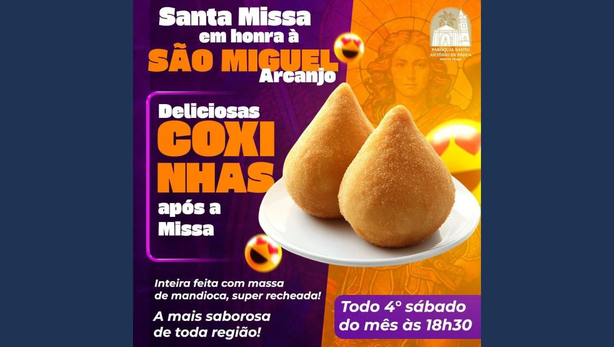 Logo após a Santa Missa, a quermesse dedicada a este poderoso arcanjo terá como novidades cama elástica, pipoca e algodão doce de graça para as crianças, além de muitas outras opções deliciosas. As coxinhas, famosas em toda a região, estarão disponíveis, assim como pastel e outras comidas típicas.