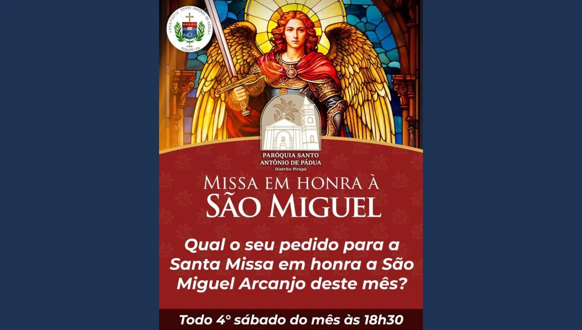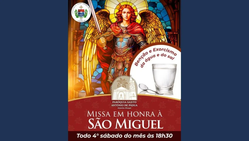 Por isso, um propósito de cada fiel: em cada quarto sábado do mês, às 18h30, na Paróquia Santo Antônio de Pádua, do Distrito do Pirapó, temos um encontro marcado com a Santa Missa em honra a São Miguel Arcanjo, com a bênção e o exorcismo da água e do sal, a ladainha de São Miguel Arcanjo.