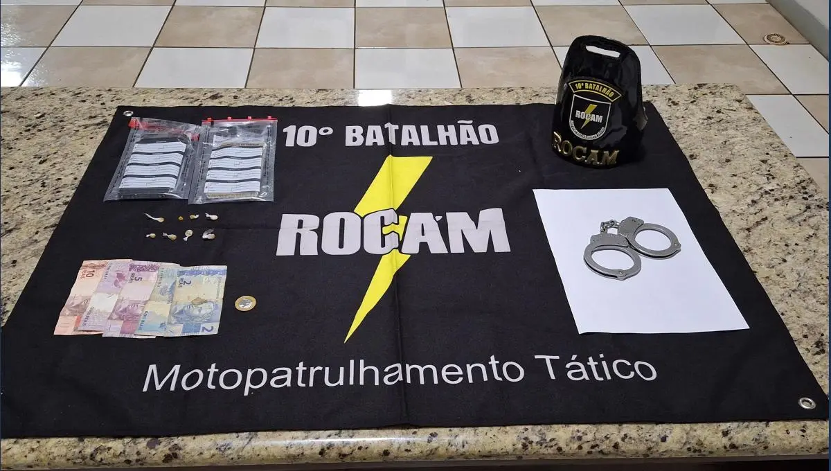Durante as buscas, a equipe encontrou mais sete porções de crack, embaladas e prontas para a venda, escondidas em uma carteira de cigarro. Também foram apreendidos dois aparelhos celulares e R$ 25 em dinheiro trocado, valor que o próprio abordado confirmou ser oriundo do tráfico. Conforme relatado, cada porção era vendida por R$ 10.
