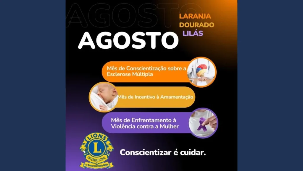 O mês de agosto é marcado por campanhas de conscientização que abordam temas de grande relevância para a saúde, o bem-estar e os direitos humanos. Em Apucarana, o Lions Clube Vitória Régia LD-6 reforça seu compromisso social ao apoiar ativamente três importantes causas: a luta contra a esclerose múltipla, a valorização da primeira infância e o combate à violência contra a mulher.
