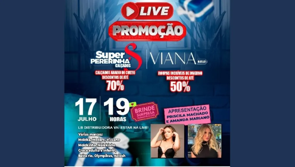 Nesta quarta-feira, dia 17 de julho, às 19h, acontecerá uma Live especial de calçados no Instagram das lojas Super Pererinha e Viana Outlet. As duas lojas se uniram para apresentar uma queima de estoque com descontos de até 70% e diversos brindes para quem estiver acompanhando ao vivo.