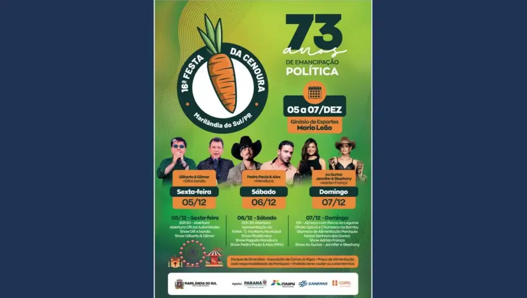Marilândia do Sul se prepara para um final de semana repleto de atrações culturais, gastronômicas e musicais durante a 16ª Festa da Cenoura, que integra as comemorações pelos 73 anos de emancipação política do município. O evento acontece de 05 a 07 de dezembro, no Ginásio de Esportes Mario Leão, com entrada gratuita.
