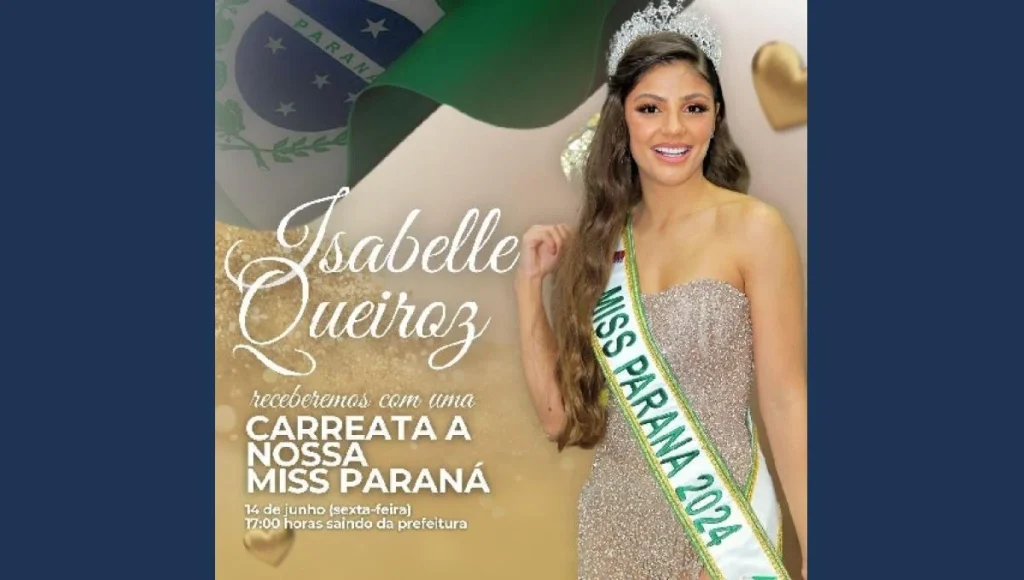 Em comemoração ao título de Miss Paraná 2024, a araponguense Isabelle Queiroz Bartoli, 23 anos, será recebida nesta sexta-feira, 14, com uma grande carreata e homenagens. O ato está marcado para às 17h, com saída em frente ao Paço Municipal (Rua das Garças, nº 750 – Centro).