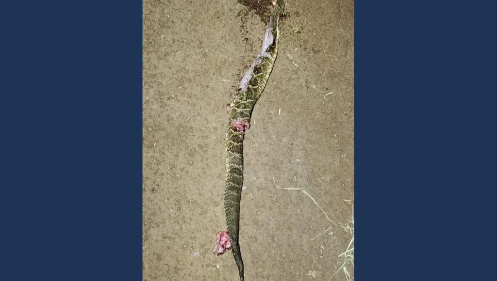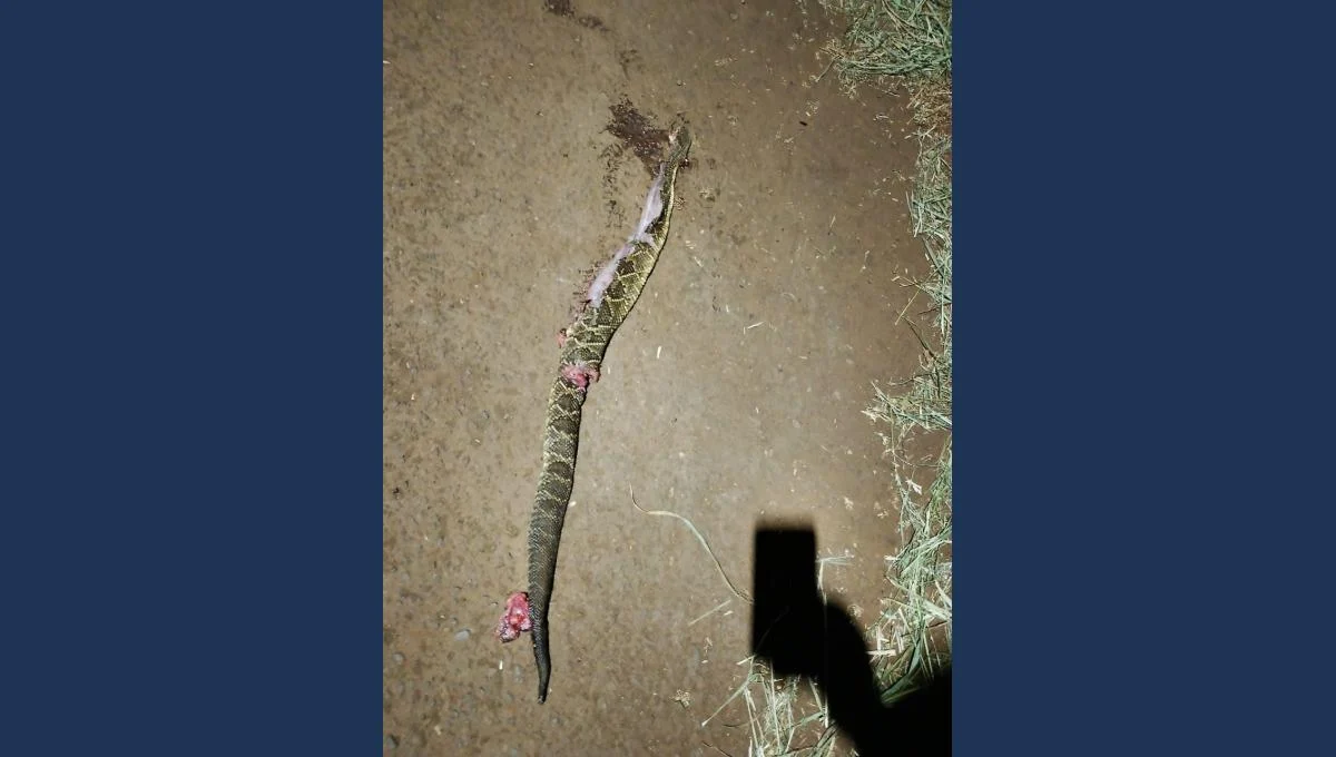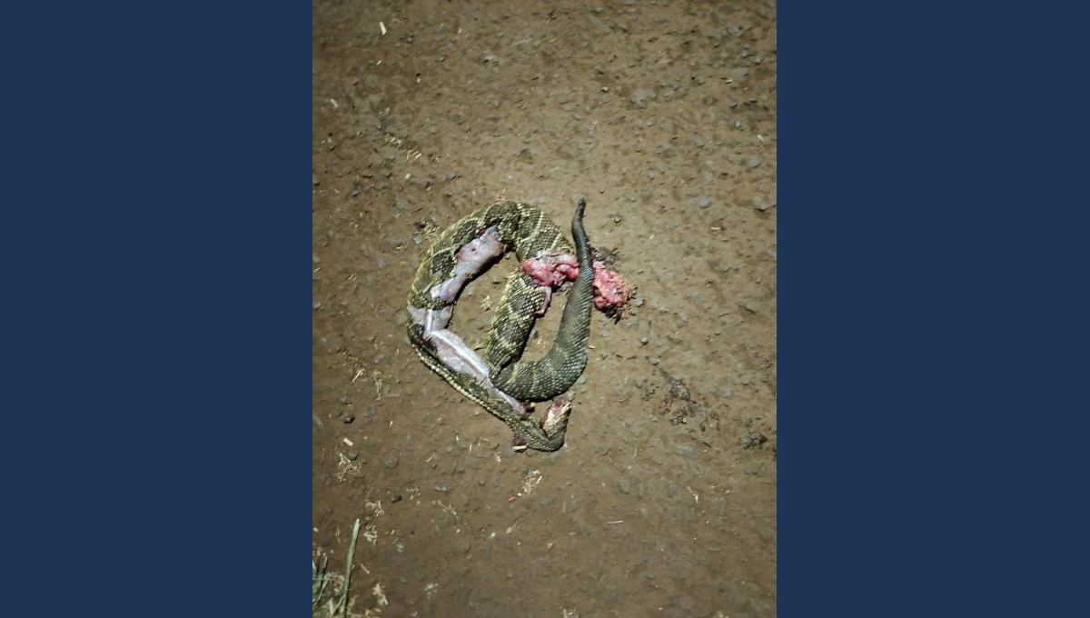 Segundo relatos enviados por populares, a serpente apareceu próxima a uma residência e, ao tentar entrar no imóvel, foi morta pelos moradores. Na semana passada, uma equipe de reportagem do Canal 38, já havia estado no local, quando uma cobra, possivelmente uma cascavel, também foi avistada na mesma rua.