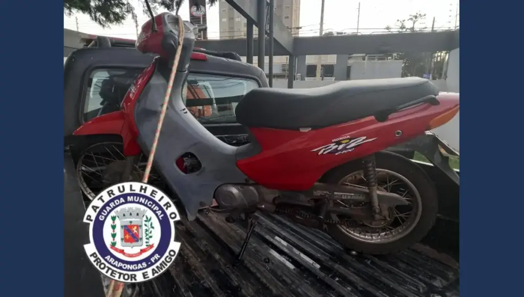 Uma motocicleta Honda Biz 100cc vermelha, furtada na tarde desta quinta-feira (11), foi localizada no início da noite por um Guarda Municipal que estava de folga. O veículo estava abandonado na Rua Narceja Americana, no Jardim Bandeirantes, em Arapongas.