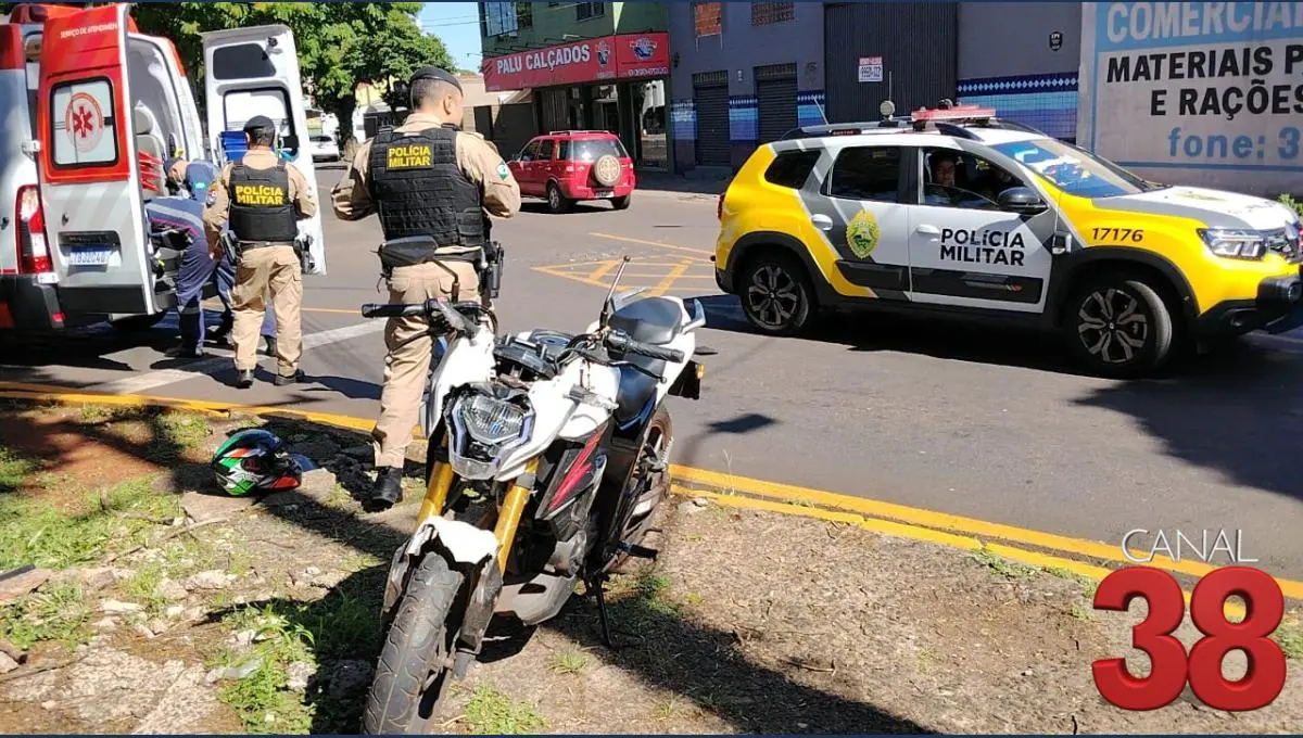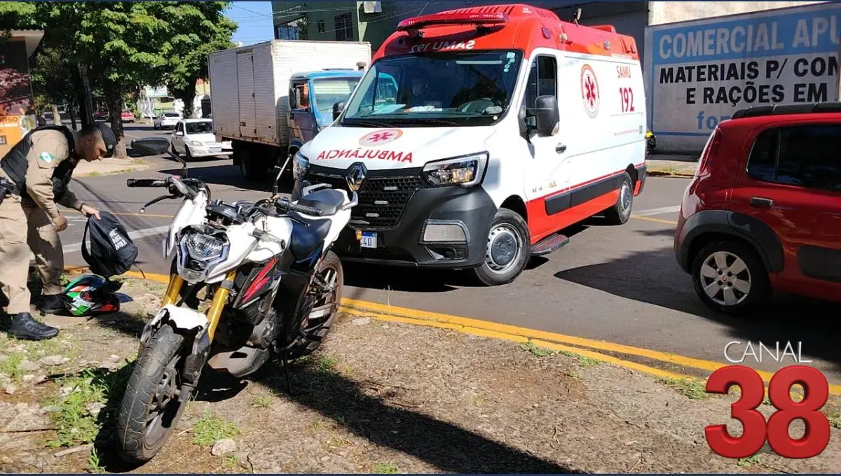 Uma colisão entre um carro e uma motocicleta foi registrada na manhã desta sexta-feira (24), na Rua Ouro Branco, esquina com a Padre Severino Cerutti, nas proximidades de um Colégio, em Apucarana.