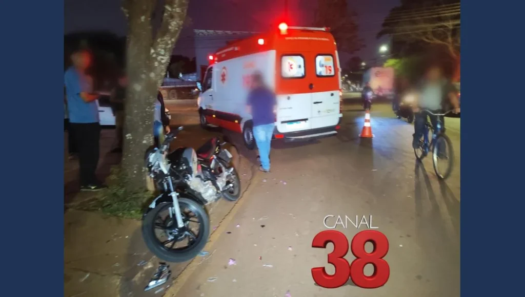 Um acidente entre um carro e uma moto deixou um motociclista de 19 anos ferido no início da noite desta sexta-feira (19) na Rua Rouxinol, em Arapongas.