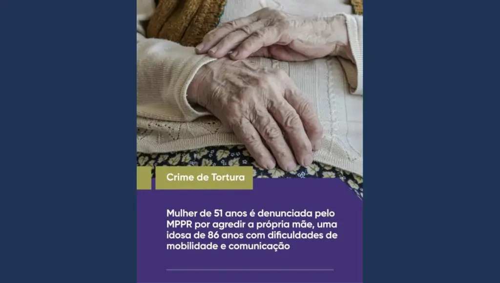 Na região Oeste do Paraná, o Ministério Público do Paraná (MPPR) ofereceu denúncia contra uma mulher de 51 anos acusada de torturar a própria mãe, uma idosa de 86 anos, de forma contínua. A denunciada, que atuava como cuidadora da vítima, foi presa preventivamente após pedido do MPPR em Guaíra.