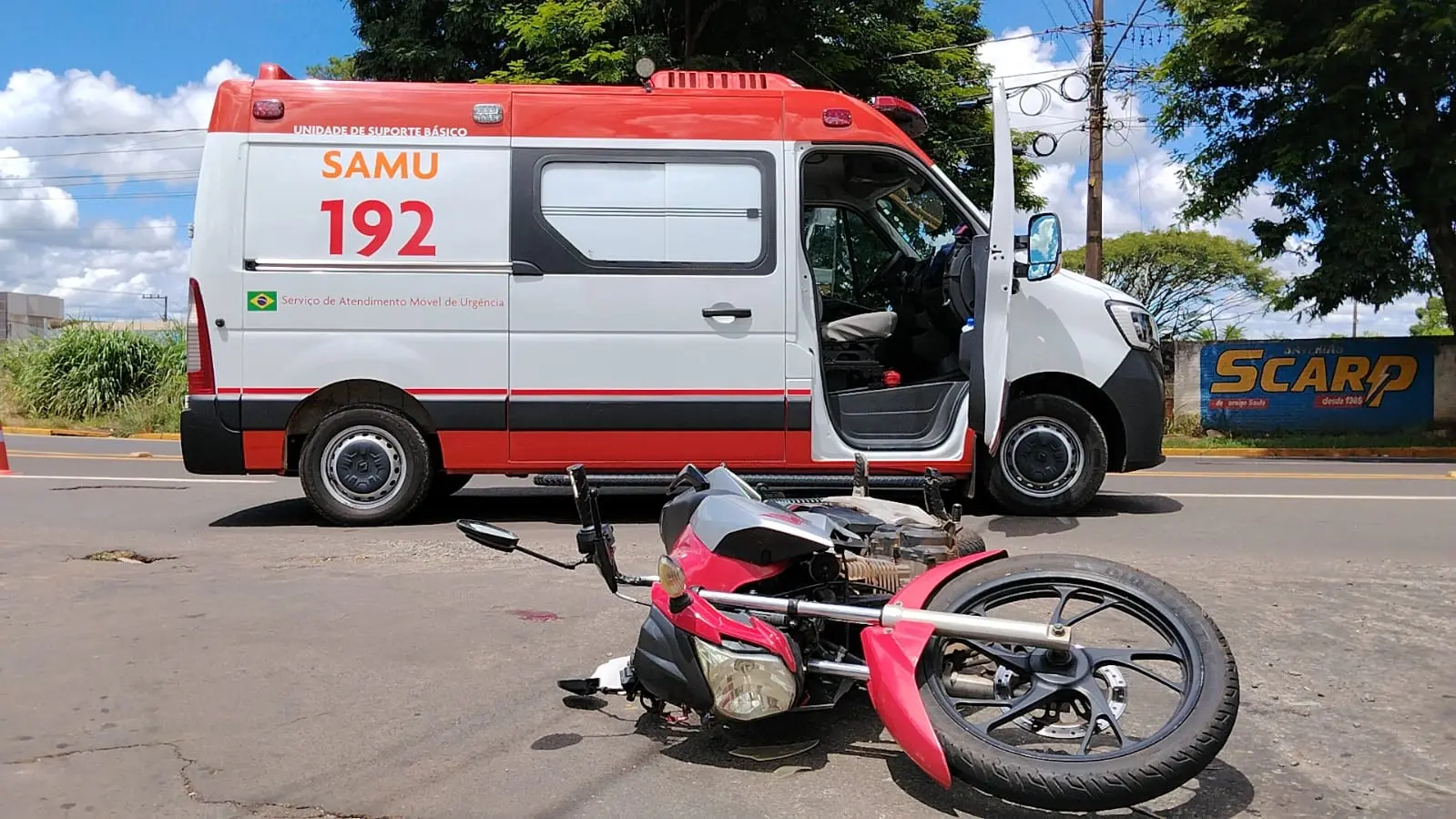 A equipe avançada do Serviço de Atendimento Móvel de Urgência (SAMU) foi acionada e prestou atendimento a uma mulher de 31 anos, condutora de uma Honda CG Titan 160. A vítima apresentava fratura exposta em um dos membros inferiores, sendo avaliada e estabilizada ainda no interior da ambulância.