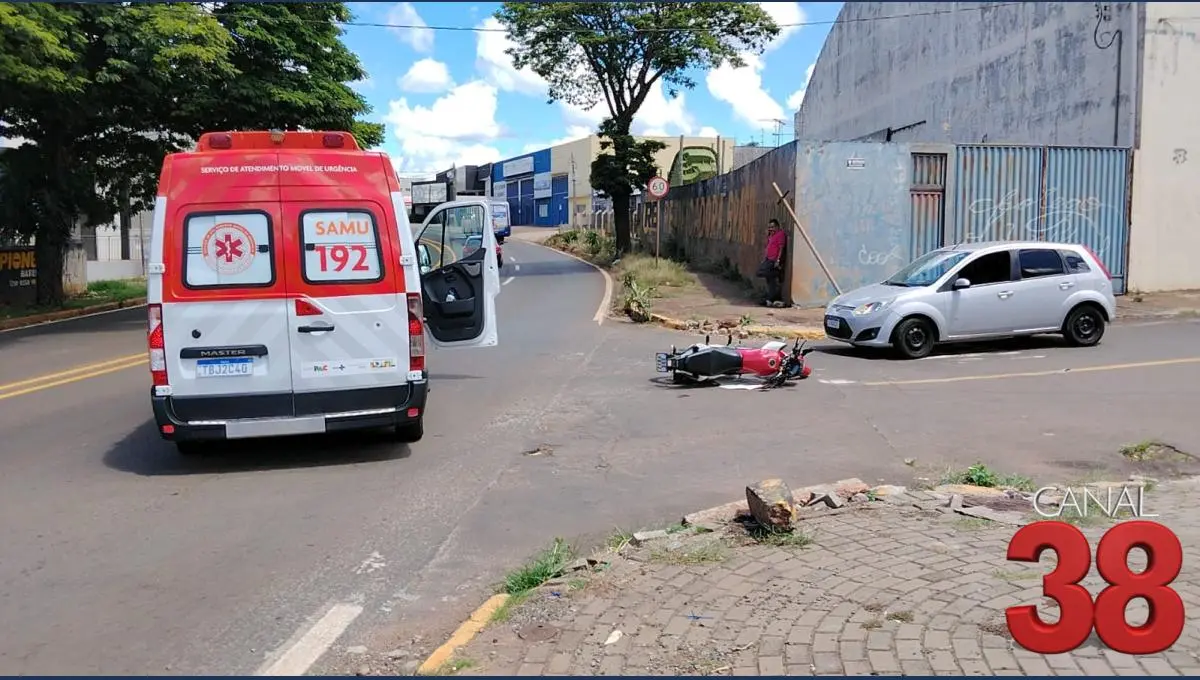 Na tarde deste sábado (24), um grave acidente de trânsito envolvendo um carro e uma motocicleta foi registrado em Apucarana. A colisão ocorreu no cruzamento da Avenida Minas Gerais com a Rua Edmundo Canizentoche.