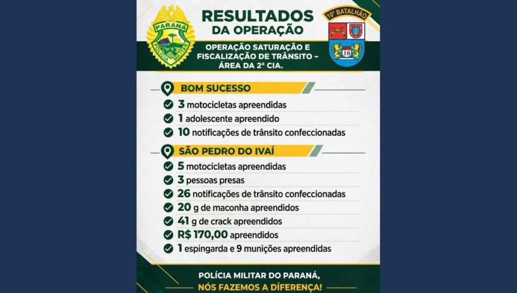 Já em São Pedro do Ivaí, os policiais apreenderam cinco motocicletas e efetuaram três prisões. No município também foram registradas 26 notificações de trânsito, além da apreensão de drogas e outros materiais.