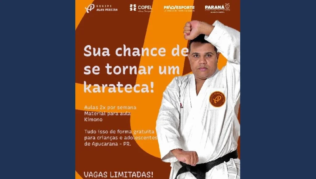 Uma excelente oportunidade está disponível para as crianças e adolescentes de Apucarana. A equipe Alan Pereira, em parceria com o Programa Estadual de Incentivo ao Esporte, está oferecendo aulas gratuitas de karatê. As aulas ocorrerão duas vezes por semana e incluem todo o material necessário, como kimono, para a prática da modalidade.