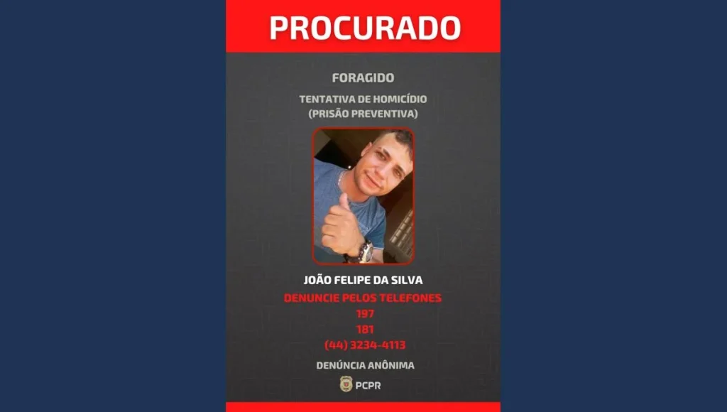 A Polícia Civil do Paraná (PCPR) divulgou nesta segunda-feira (11) a imagem de João Felipe da Silva, de 30 anos, foragido por tentativa de homicídio ocorrida em 28 de julho deste ano, em Iguaraçu, no Noroeste do Estado.