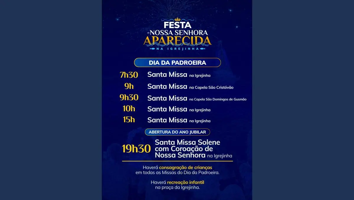 Em todas as missas haverá consagração das crianças, momento especial de bênção e entrega à proteção da Mãe Aparecida. Além disso, as famílias poderão aproveitar a recreação infantil na praça da Igrejinha durante o dia.