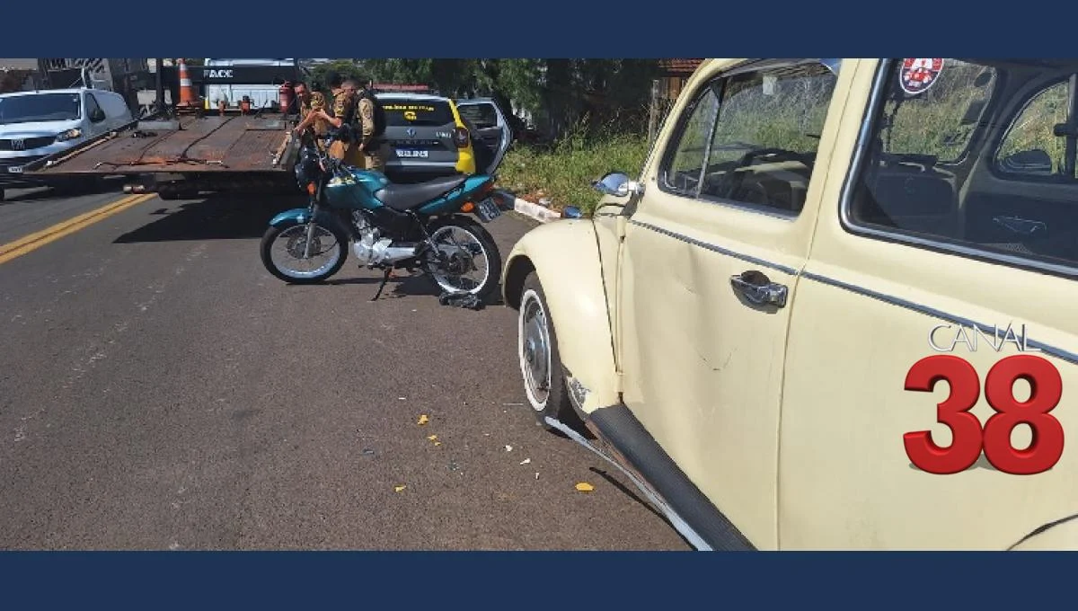 Durante o acompanhamento tático, o suspeito perdeu o controle da moto ao entrar na Avenida América, colidindo com um Fusca que estava estacionado na via.