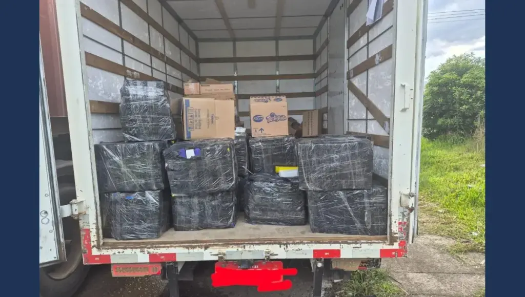Os veículos, uma carreta e um caminhão baú de pequeno porte, estavam estacionados em uma rua do bairro. Os condutores, um homem de Santos (SP), que dirigia a carreta, e outro de Curitiba, responsável pelo caminhão menor, foram presos em flagrante.