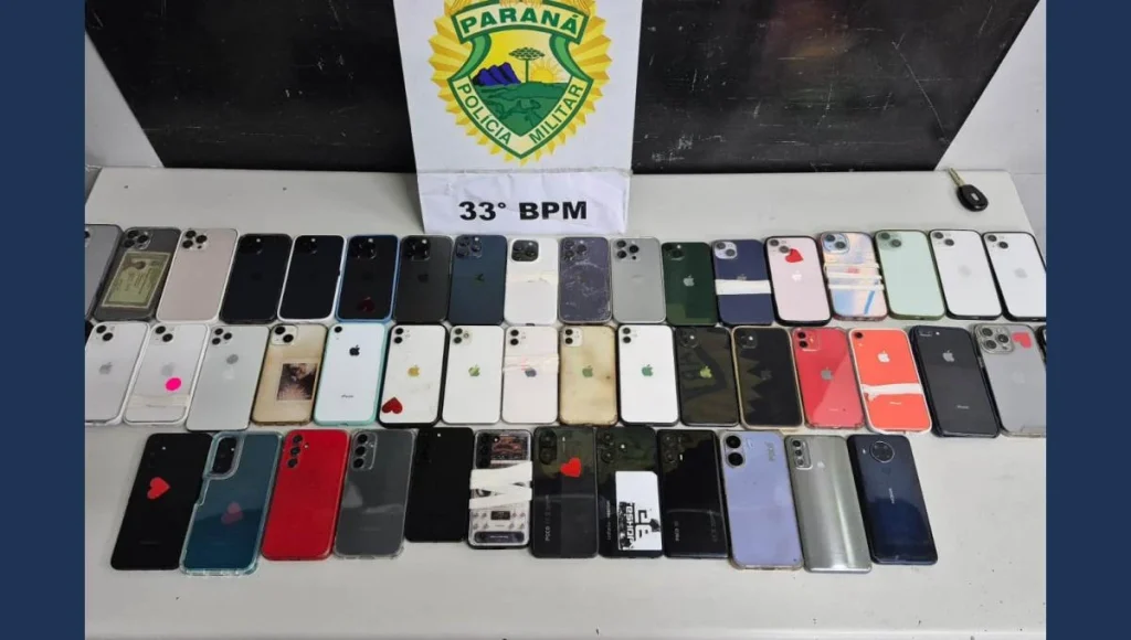 Dentro do veículo, uma mala de viagem foi encontrada no banco de trás. Nenhum dos ocupantes assumiu ser o dono dela. Ao abrirem a mala, os policiais encontraram dezenas de celulares de marcas como Apple, Samsung e Motorola, embrulhados em roupas e papel alumínio, técnica comum para dificultar o rastreamento.